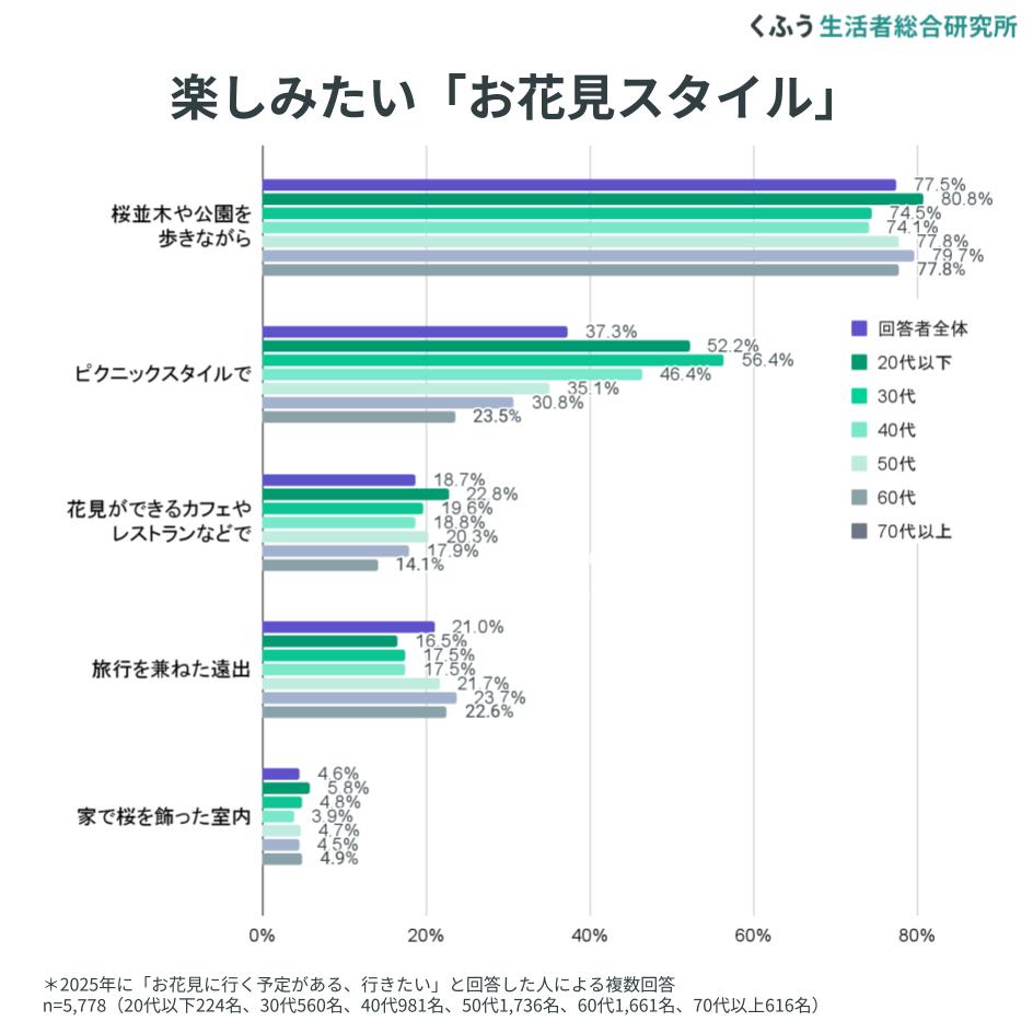 お花見は「歩きながら」が約8割、「ピクニックスタイル」約4割を大きく上回る