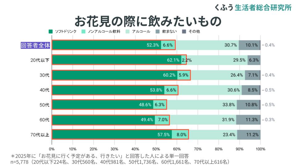 お花見で最も飲みたいものとしては、いずれの年代でも半数以上がソフトドリンクやノンアルコール飲料と回答しており、運転などやむを得ない事情がありつつも、飲酒のない"ノンアル花見"が主流となっていることがわかります。