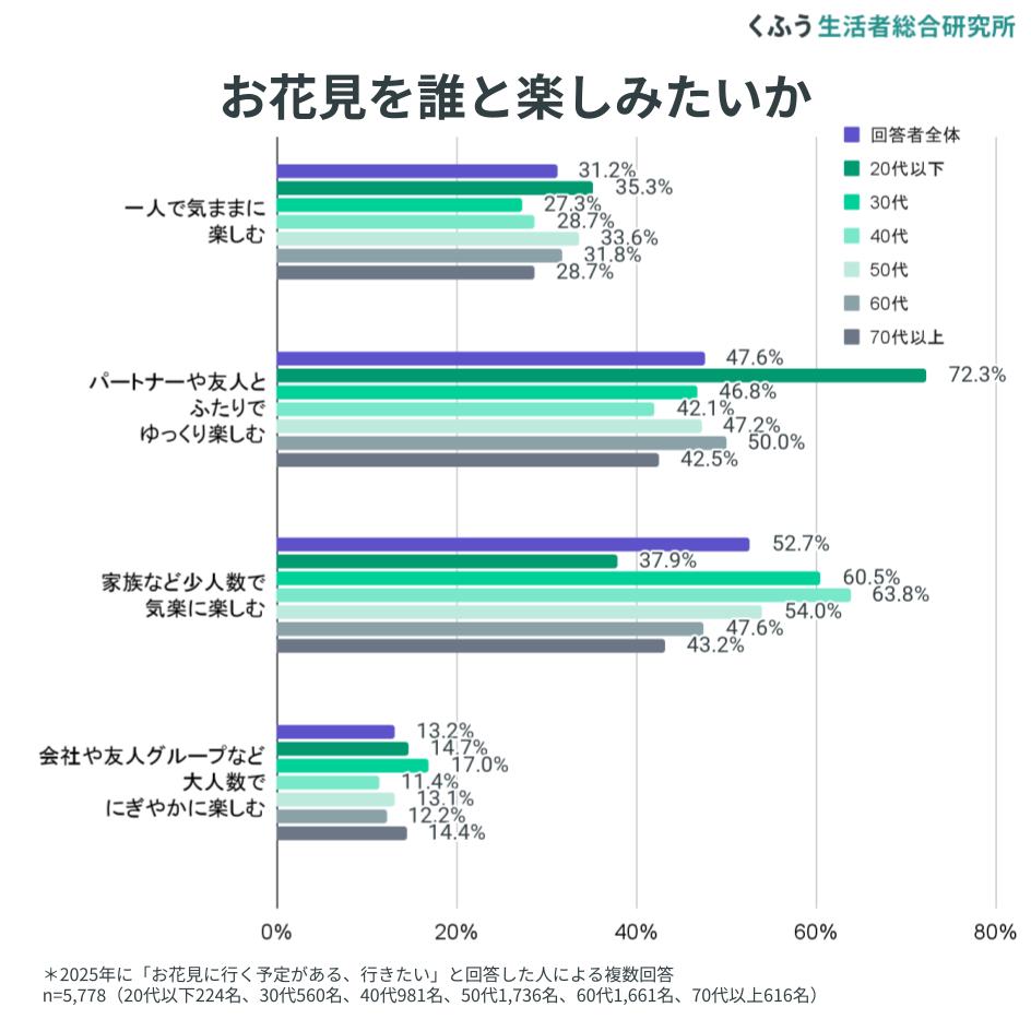 お花見を誰とどのように楽しみたいかをたずねたところ、回答者全体では「家族など少人数で気楽に」(52.7%)が最も多く、「パートナーや友人とふたりでゆっくり」(47.6%)、「一人で気ままに」(31.2%)が続きました。