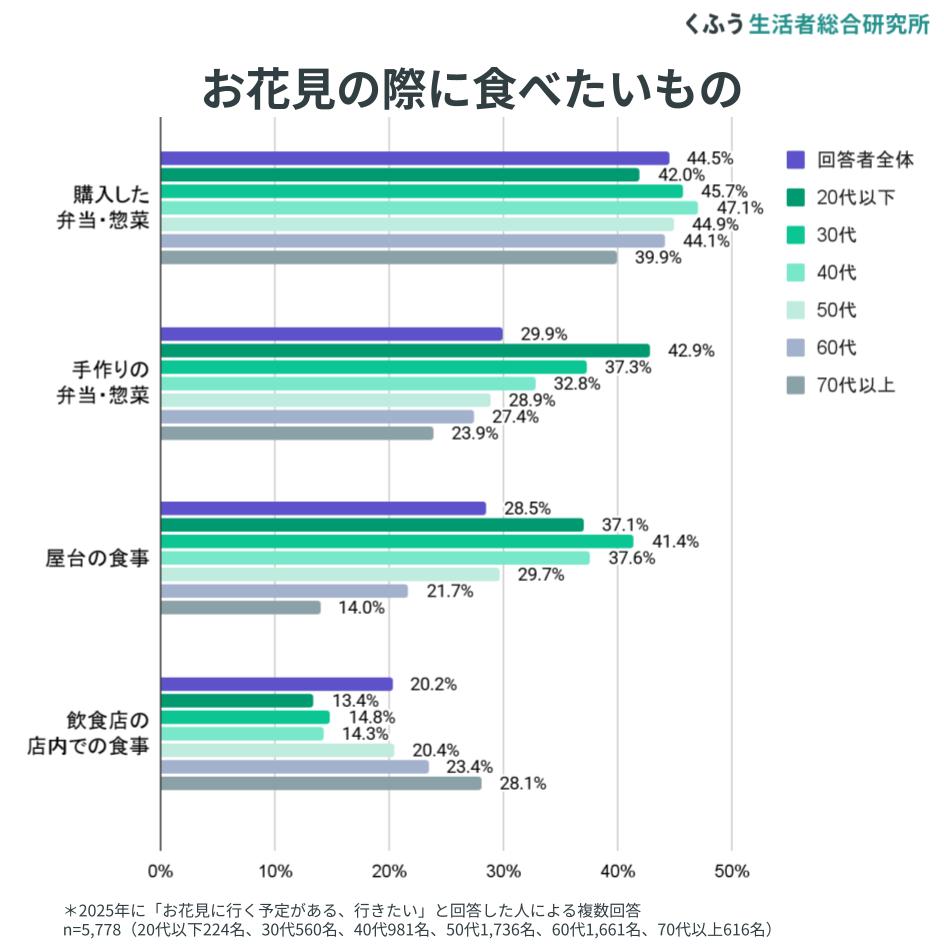 年代別に見ると、「手作りの弁当・惣菜」では年代が上がるほど求めている人が少なく、「屋台の食事」は40代までの世代により好まれていることが特徴的です。また、先述の「お花見で楽しみたいこと」の回答結果で「屋外での飲食」を求める割合が低かった50代以上においては、屋外ではなく「飲食店の店内での食事」を希望する人が他の年代よりも多いことがわかります。