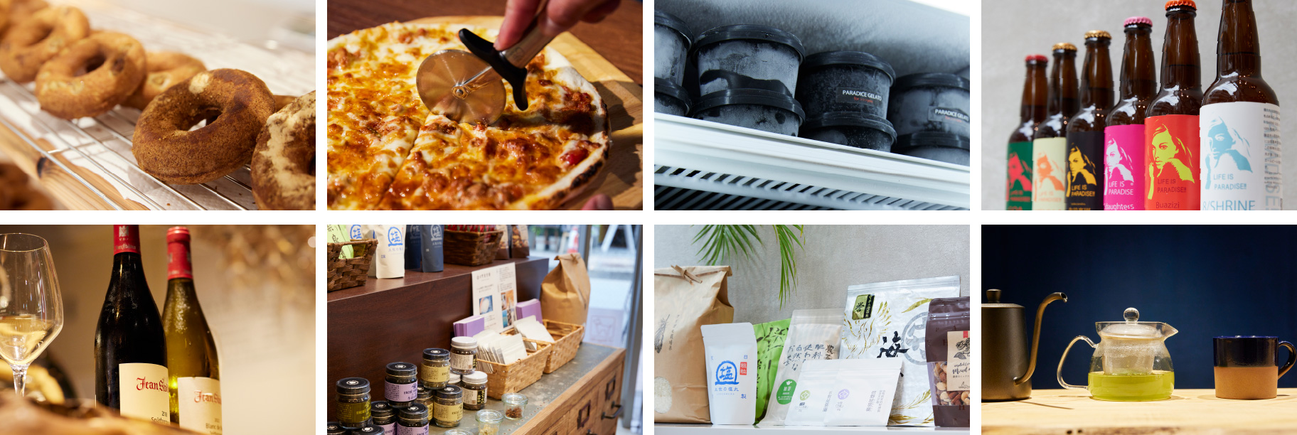 ・ オーガニックおからドーナッツ ・ ジェラート ・ ピザ(自然栽培小麦使用) ・ 自然栽培米(アイガモ栽培米) ・ 各種調味・ ピザ(自然栽培小麦使用) ・ 自然栽培米(アイガモ栽培米) ・ 各種調味・ クラフトビール ・ ワイン/スパークリング(オーガニックワイン/スパークリング) ・ ジュース(無添加)