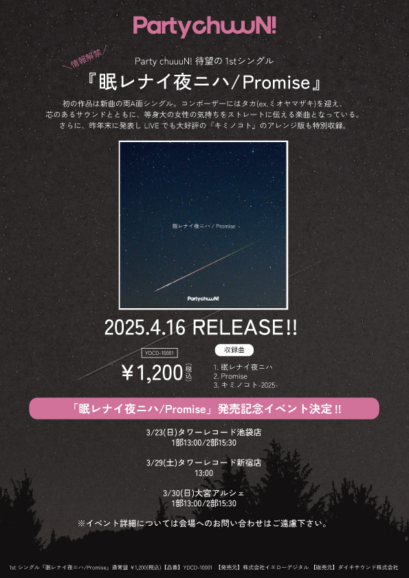 2025年4月16日、1stシングル『眠レナイ夜ニハ/Promise』(両A面)の発売が決定しました。