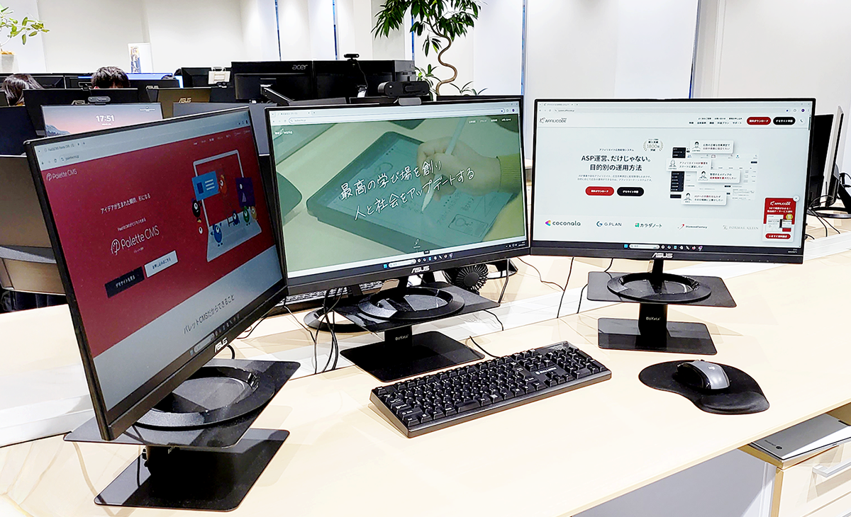 厚生労働省発出の「情報機器作業における労働衛生管理のためのガイドライン」に基づき、作業環境を精査。個々の体格差によって、一部のメンバーにおいてディスプレイの高さが理想とは異なる状況であることを確認し、モニター台を導入しました。