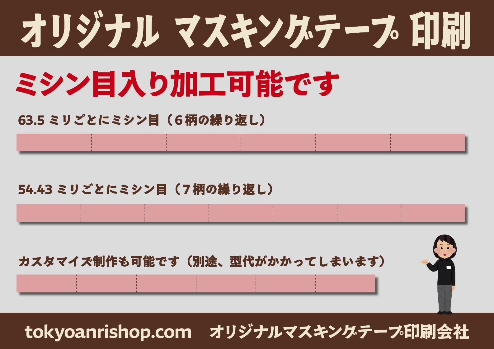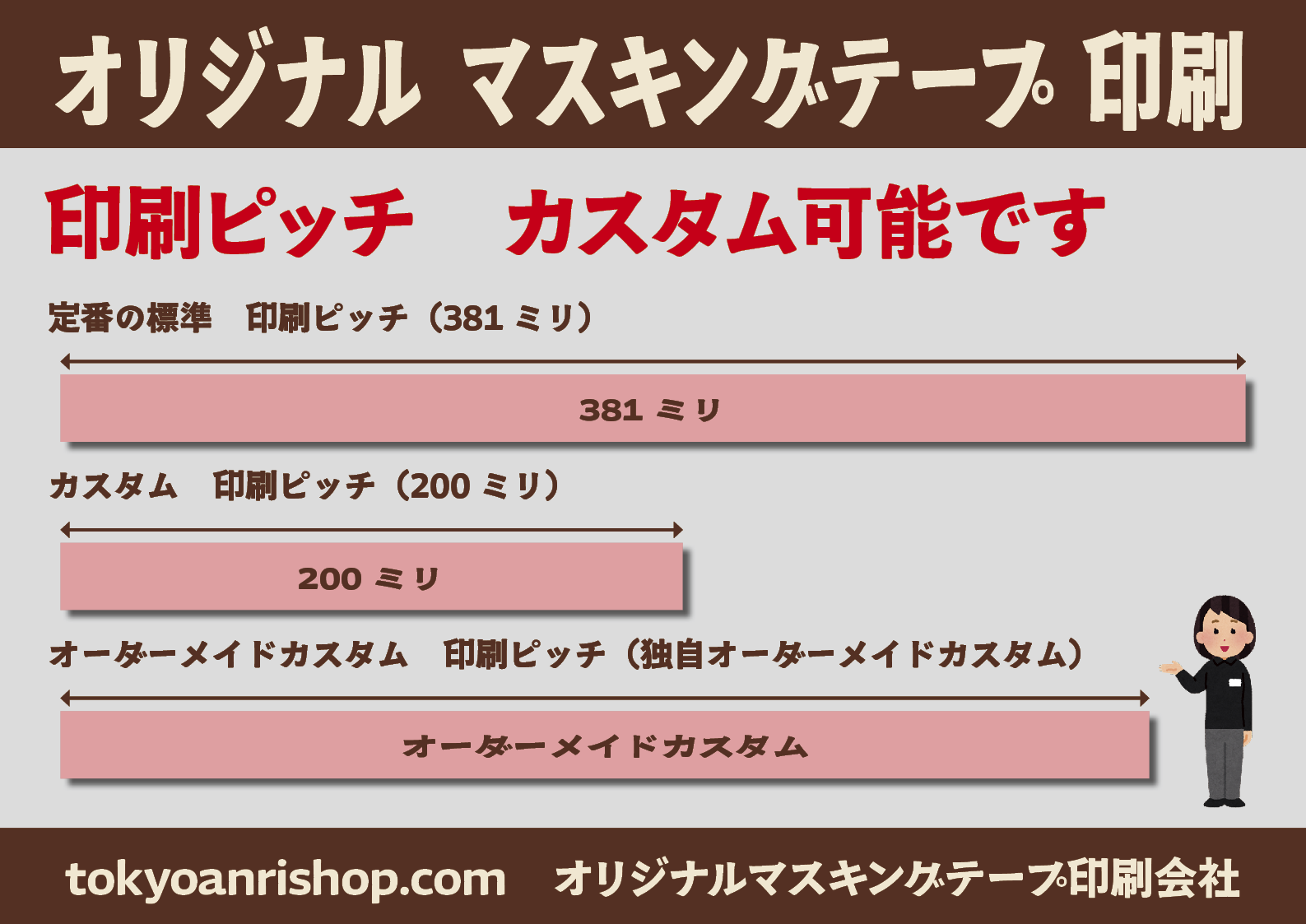 マスキングテープの印刷ピッチ、幅、等のオーダーメイドでのカスタム制作も可能です!