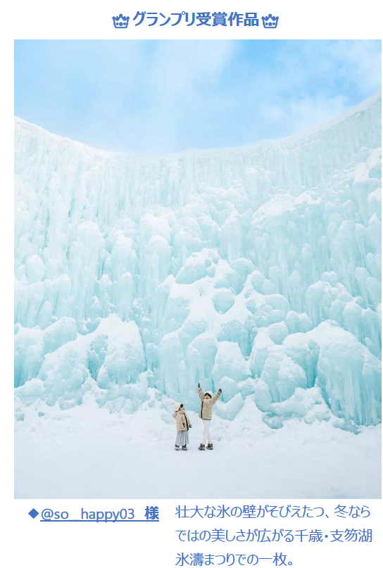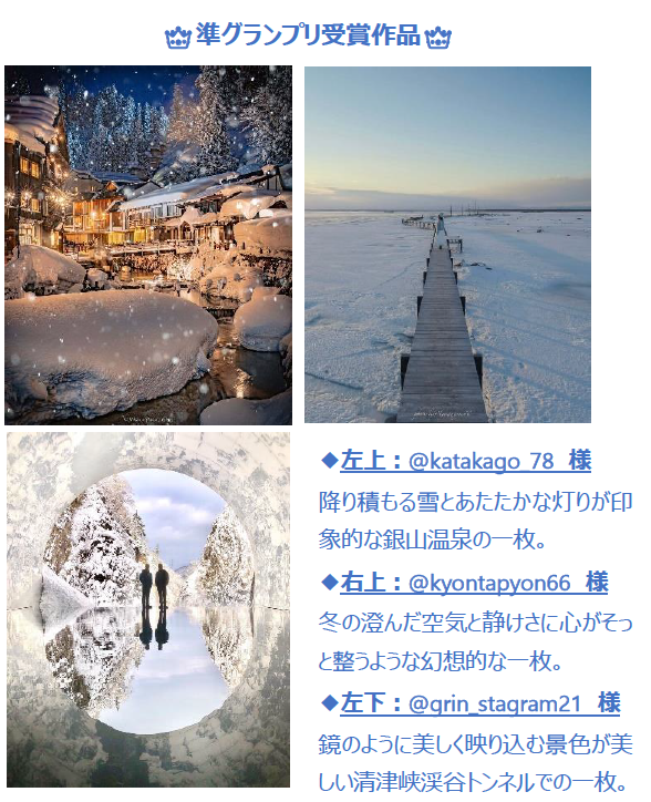 今回のコンテストでは約3,200件の応募をいただき、雪や氷のイベント、冬の凛とした光景などの素敵な投稿が多く寄せられましたが、その中より、つぎの4点(グランプリ1件,準グランプリ3件)の作品を入賞として選定させていただきました。ご参加された皆さまに、あらためて御礼を申し上げます。