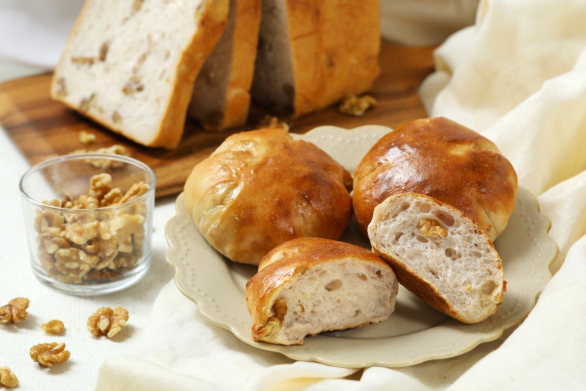 - 噛めば噛むほど味わい深いくるみパンは、食事パンとしておかずと合わせてお楽しみいただくのもおすすめです。