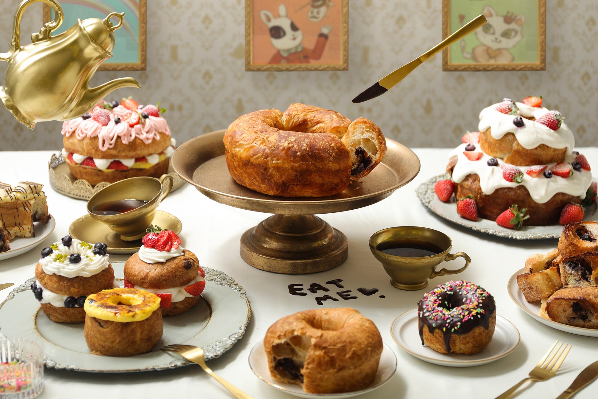 また、店内では看板商品「マジカルチョコリング」をはじめ、パリッと焼き上げたフランスパンの中にとろ〜っとしたチーズがたっぷり入った「のび~るとろりんチーズフランス」や、もっちりやわらかな食パンに小豆の粒感を残したほどよい甘さのあんこをたっぷり使用した「あんこはもうたくさん!あんこ中毒な太っちょ王様のあん食パン」などの商品をご用意。まるでおとぎ話に迷い込んだようなマジカルな世界観の店内には、おいしさはもちろんお客さまをワクワクさせる商品をつくりたい、そんな想いのもとに作られたパンやスイーツが並んでいます。