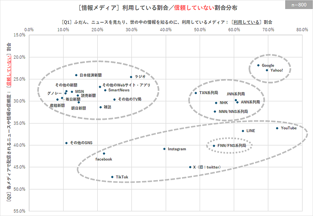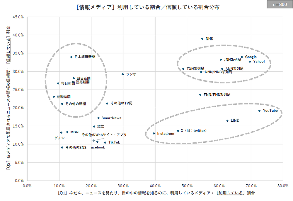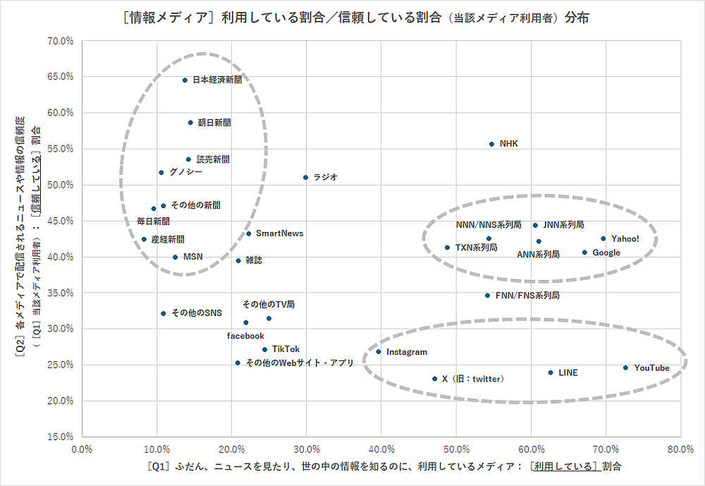 最初のグラフ(①)は、今回の設問結果をもとに、[利用している]割合と[信頼している]割合の値を用いて、各メディアの分布をプロットしたものである。