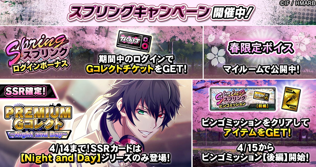 期間中、ビンゴミッションやログインボーナスを開催しているほか、マイルームでは「春」に関するボイスを公開中です。詳細はアプリ内お知らせをご確認ください。