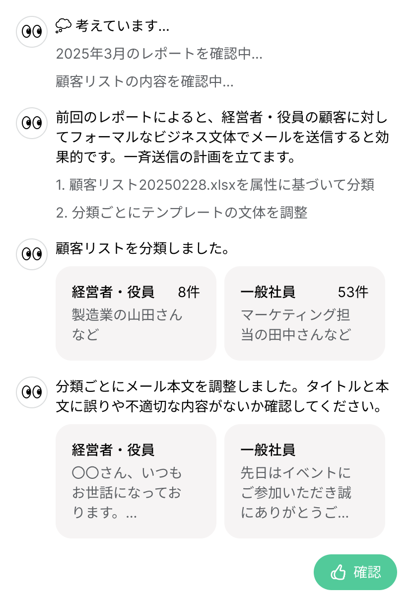 - 顧客属性に応じて文体を自動最適化(例:経営者=フォーマル、社員=カジュアル)