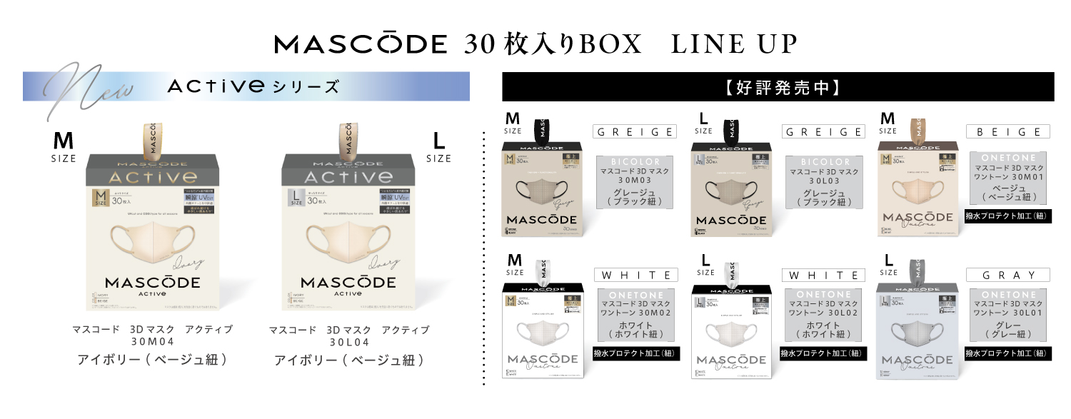 ファッション×機能性を両立したマスクブランド『MASCODE(マスコード)』のUVカット&接触瞬間冷感機能*を備えた「Activeシリーズ」より30枚入りのBOXシリーズが新登場