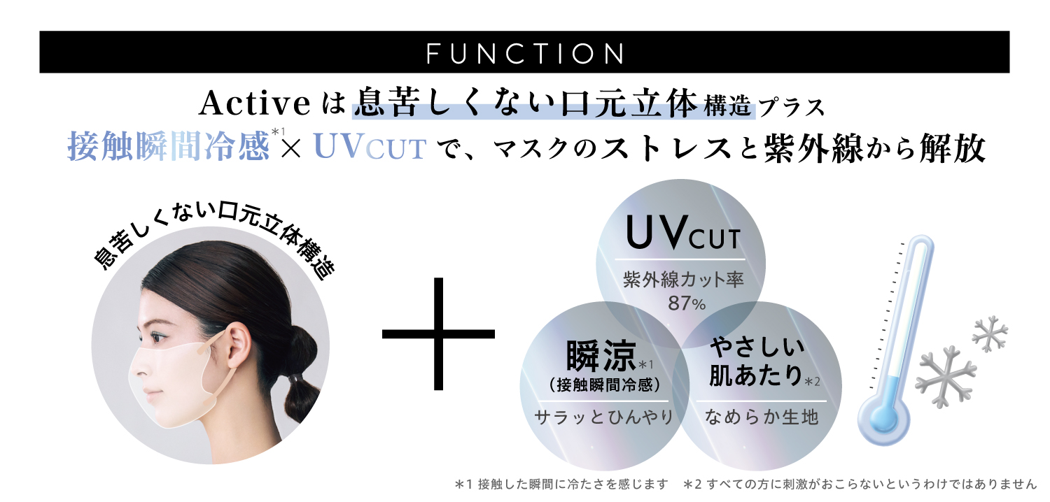 「MASCODE(マスコード)」は、ファッション性と機能性を両立させ、「マスクにドレスコードを」というコンセプトでTPOや服装、その日の気分に合わせてマスクを選び、組み合わせる新しい楽しみを提供してまいりました。そんな新たなマスクのスタイルを提案するブランドとして、「MASCODE Active」シリーズはUVブロック、接触瞬間冷感※1、やさしい肌あたり※2という特徴を兼ね揃え屋外はもちろん、会話が増えるアクティブなシーンでより快適に、安心して着用できるアイテム。