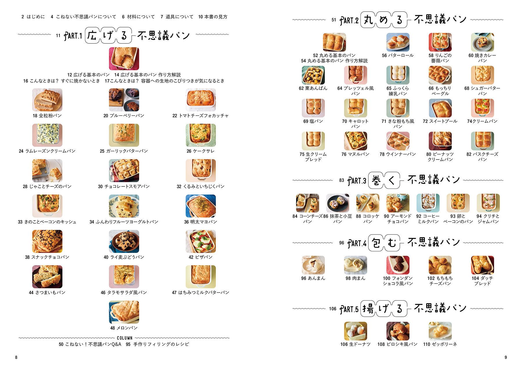 基本のパン/全粒粉パン/ブルーベリーパン/トマトチーズフォカッチャ/ラムレーズンクリームパン/ガーリックバターパン/ケークサレ/じゃことチーズのパン/チョコレートスモアパン/くるみといちじくパン/きのことベーコンのキッシュ/ふんわりフルーツヨーグルトパン/明太マヨパン/スナックチョコパン/ライ麦ぶどうパン/ピザパン/さつまいもパン/タラモサラダ風パン/はちみつミルクバターパン/メロンパン