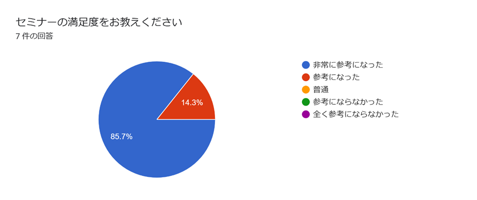 ■総合満足度: 参加者の100%がセミナー内容に「非常に参考になった」または「参考になった」と回答し、大変高い満足度を示しました(内訳:非常に参考になった 85.7%、参考になった 14.3%)