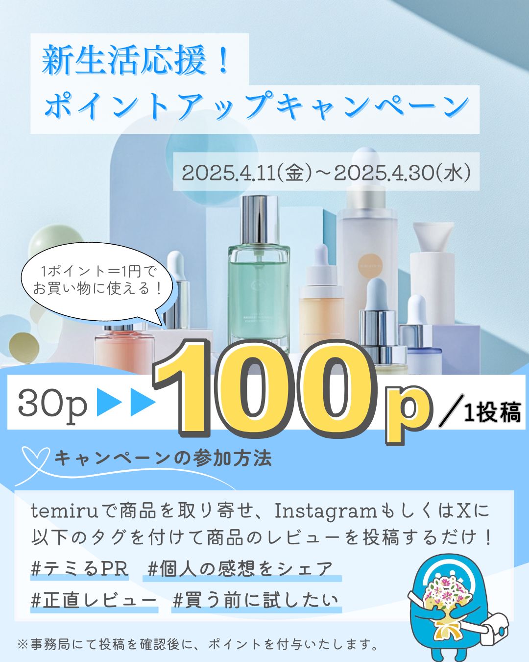 参加方法は、temiruで化粧品を取り寄せてInstagramまたはXに口コミを投稿するだけ。指定のタグを付けて投稿いただくと、通常1投稿につき30ptのところ、100ptを付与いたします。