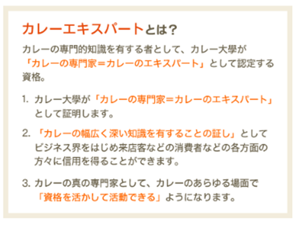 特 典:受講終了した方は「カレーエキスパート」資格が取得できます。