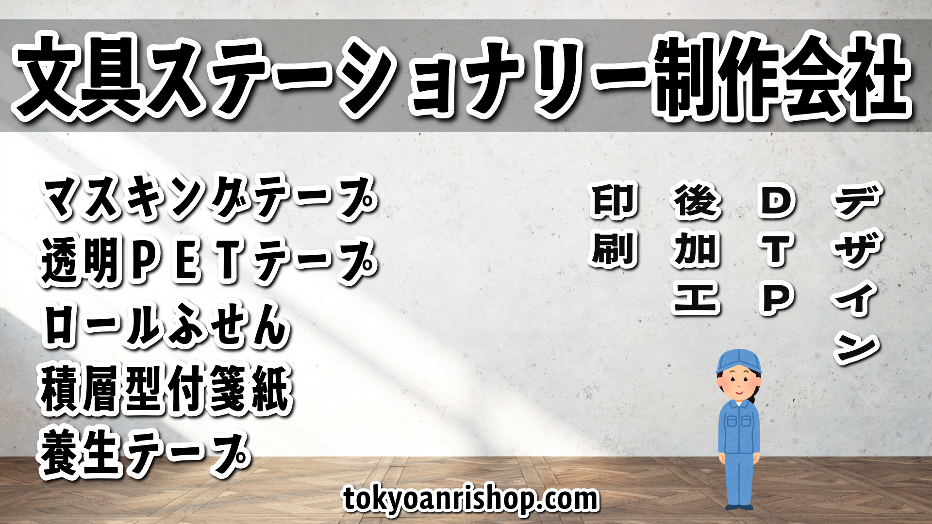 ステーショナリー制作なら tokyoanrishop.com へご相談ください。実店舗での対面相談可能(ロール付箋、マスキングテープ、透明PETテープ、養生テープ、積層型付箋のオリジナル印刷可能)