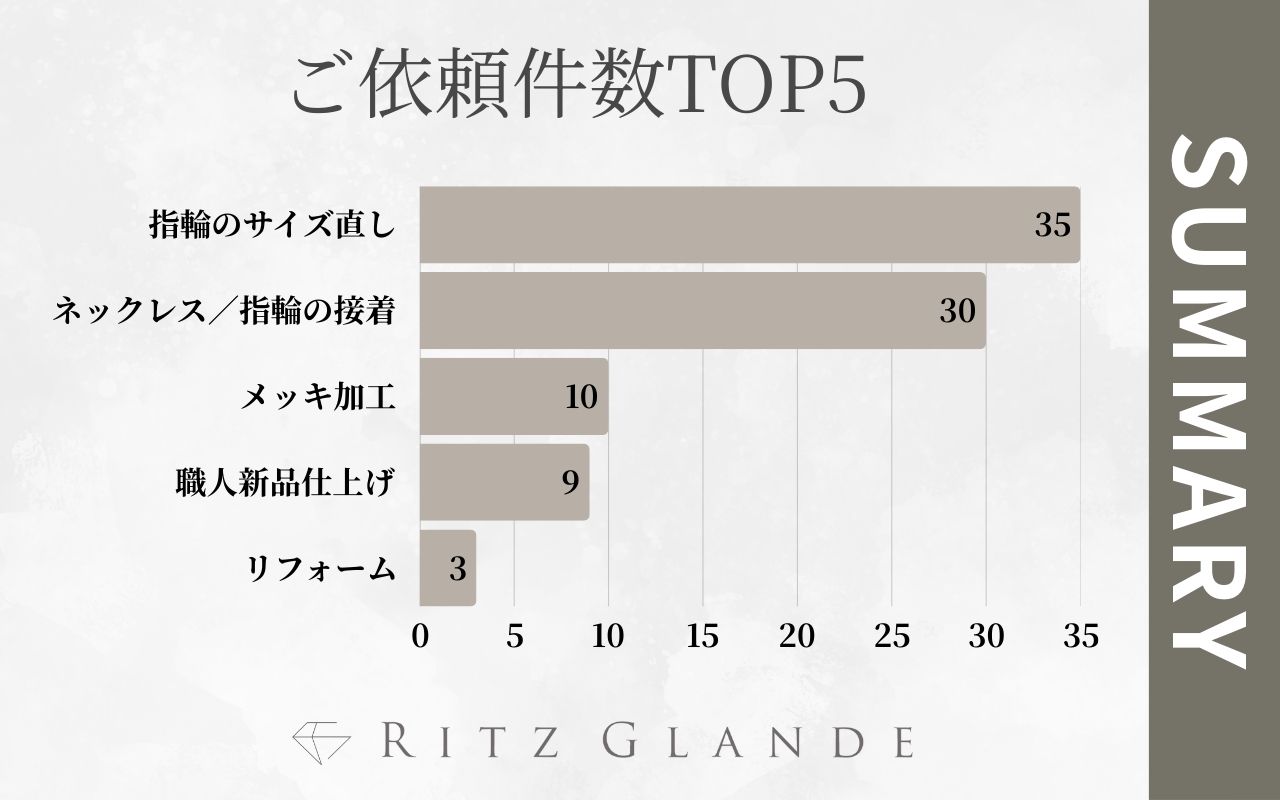 最も多くのご依頼をいただいたのは「指輪のサイズ直し」で、合計35件となりました。この結果から、指輪は日常的に使用されるアクセサリーであるため、サイズ変更のニーズが非常に高いことが伺えます。