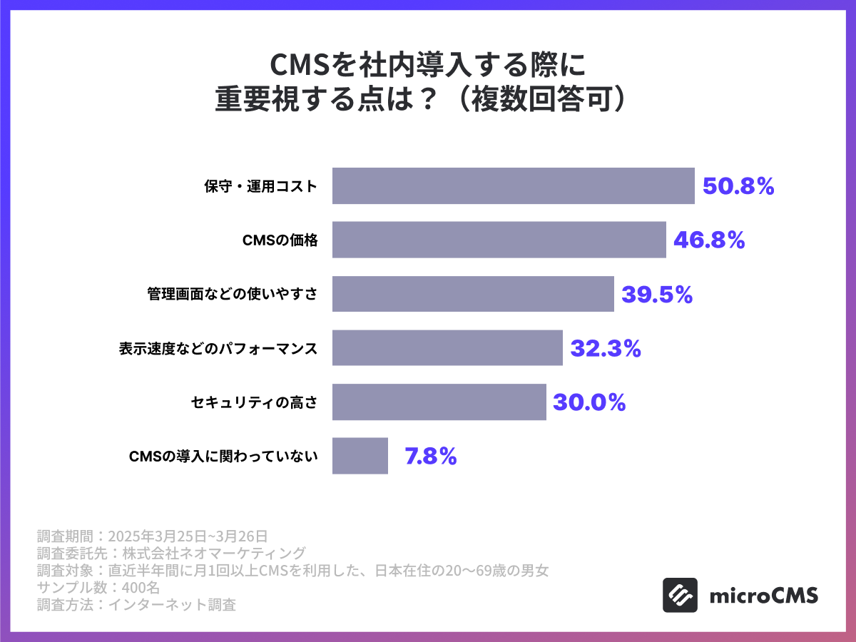 創造性と技術力で多様なITサービスを展開する株式会社エイチームホールディングスのグループ会社で、国内最大級規模(※)の利用実績を誇るヘッドレスCMS「microCMS」を運営する株式会社microCMS(本社:東京都千代田区、代表取締役:松田承一、以下当社)において、月1回以上の頻度でCMSの利用がある正社員・会社役員400人を対象に、CMSの認知度や、選定する際の判断軸に関する調査を実施しました。