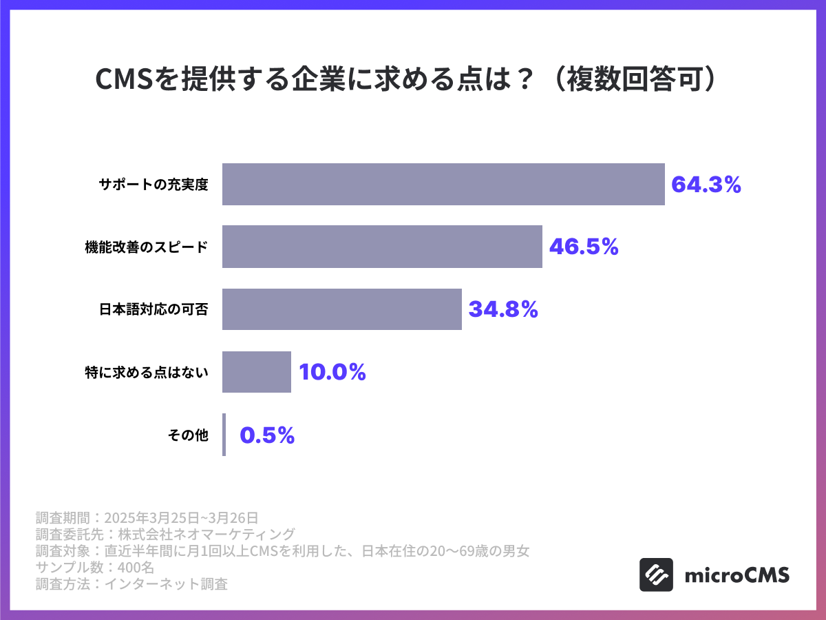 CMSを提供する企業に求めるのは「サポートの充実度」が最多、次いで「機能改善のスピード」