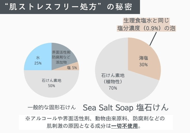 そのため、「Sea Salt Soap 塩石けん」の泡は目や傷に入ってもしみにくく、やさしい洗い心地を実現しているのです。
