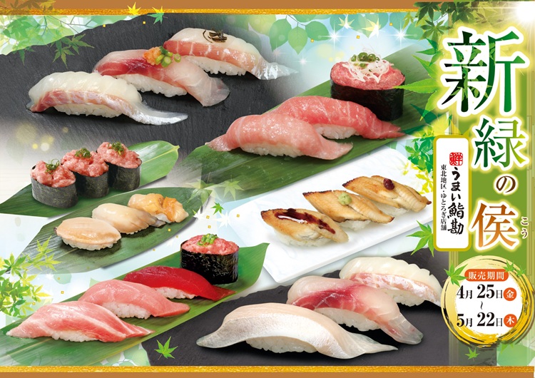 株式会社アミノ(本社:宮城県仙台市、代表取締役社長:上野 敏史)が運営する寿司業態 「うまい鮨勘」では、東北地区・ゆとろぎ店舗において「新緑の候(こう)」と題したフェアを2025年4月25日(金)から5月22日(木)までの期間限定で販売いたします。ゴールデンウィークおはじめ、行楽のお食事は「うまい鮨勘」で決まり!
