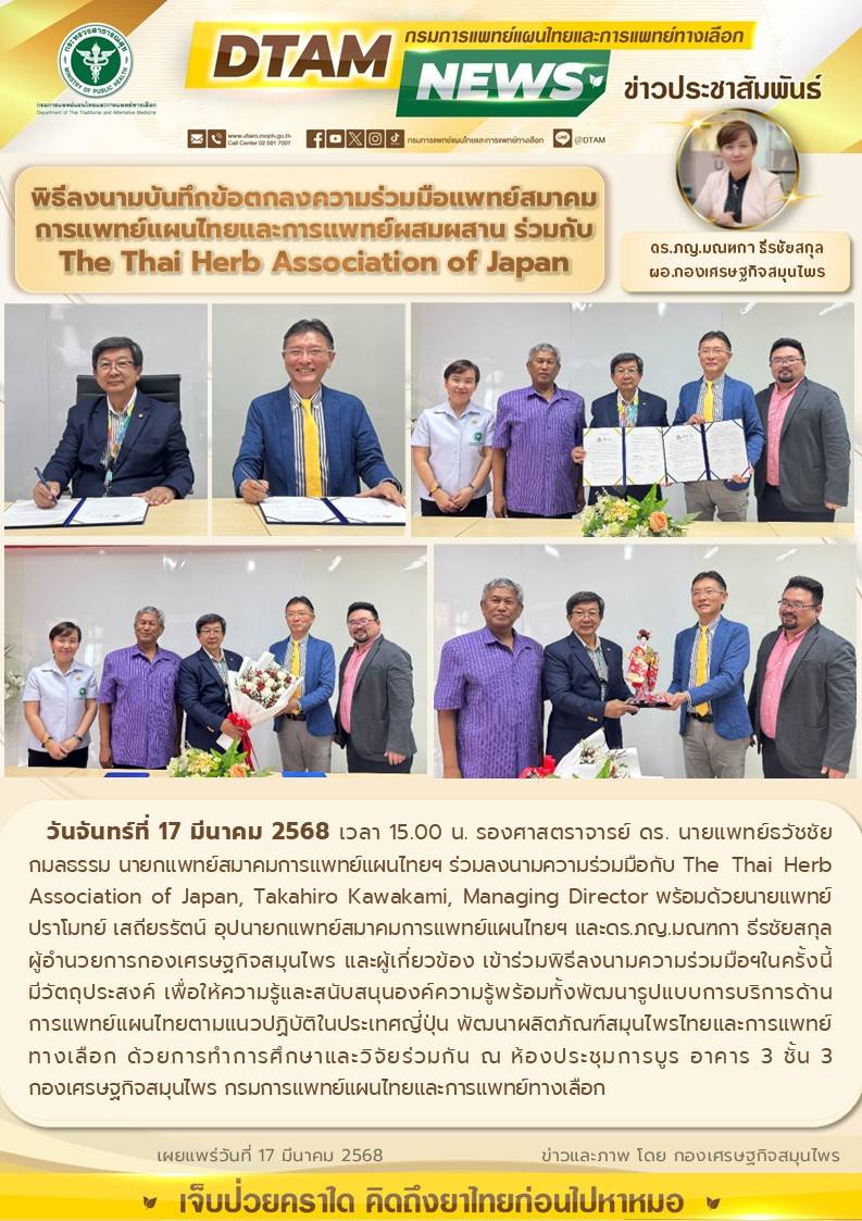 2025年3月15日にタイ王国保健省タイ伝統・代替医療局において、タイ伝統・代替医療医師協会(会長:Thawatchai Kamoltham)と、一般社団法人日本タイハーブ協会(代表理事:木村理恵)間で、タイ保健省の政策である伝統医療にかかわる研究・啓蒙を推進するため、以下の協力指針を掲げ、共同で研究を行い、タイ伝統医療・代替医療を発展することにより、健康増進を実現する旨の覚書を締結いたしましたことをお知らせします。