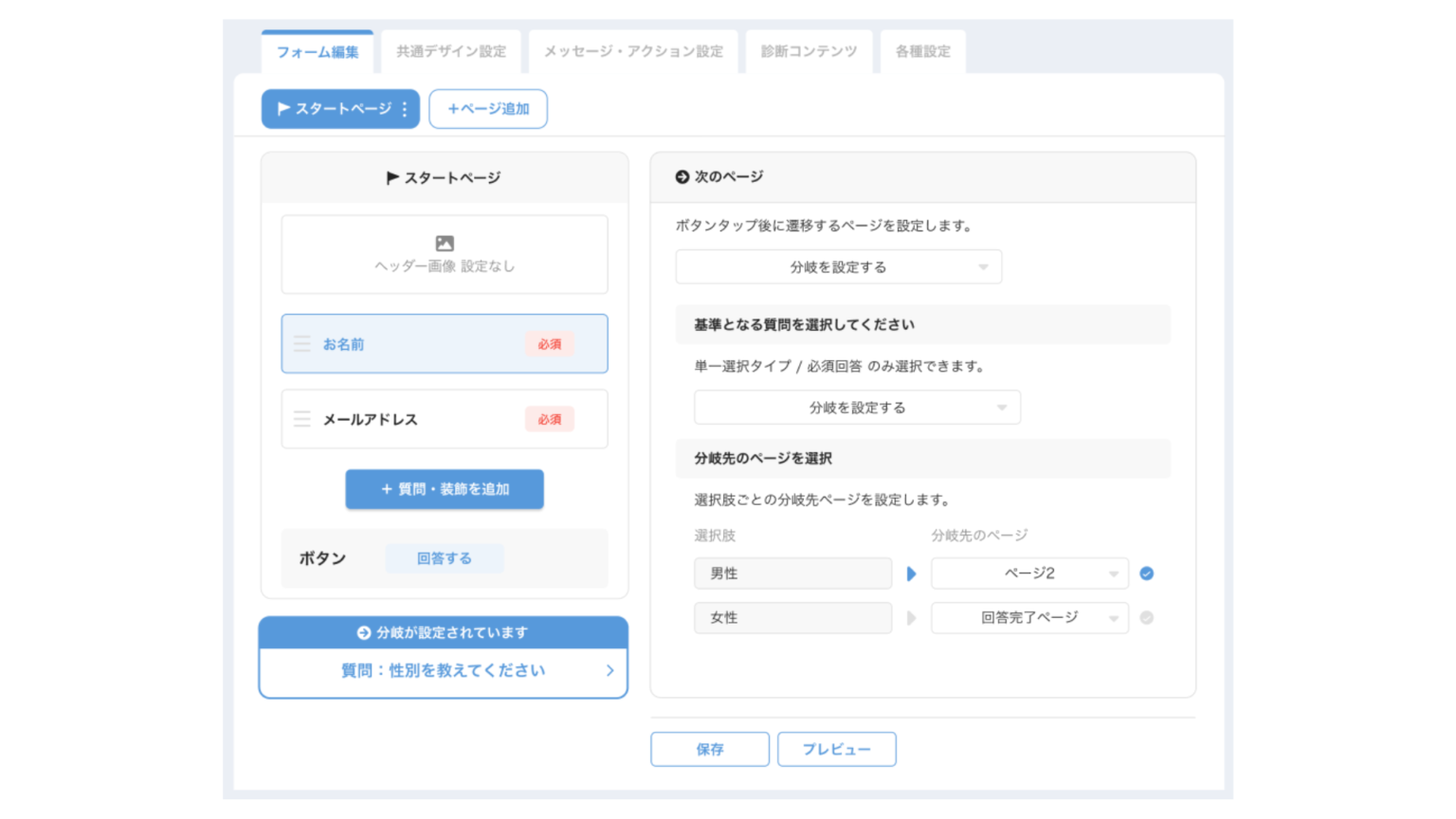 ラジオボタンやプルダウン形式を使い、ユーザーの選択肢に応じて次に表示する質問内容を自動切り替えできます。