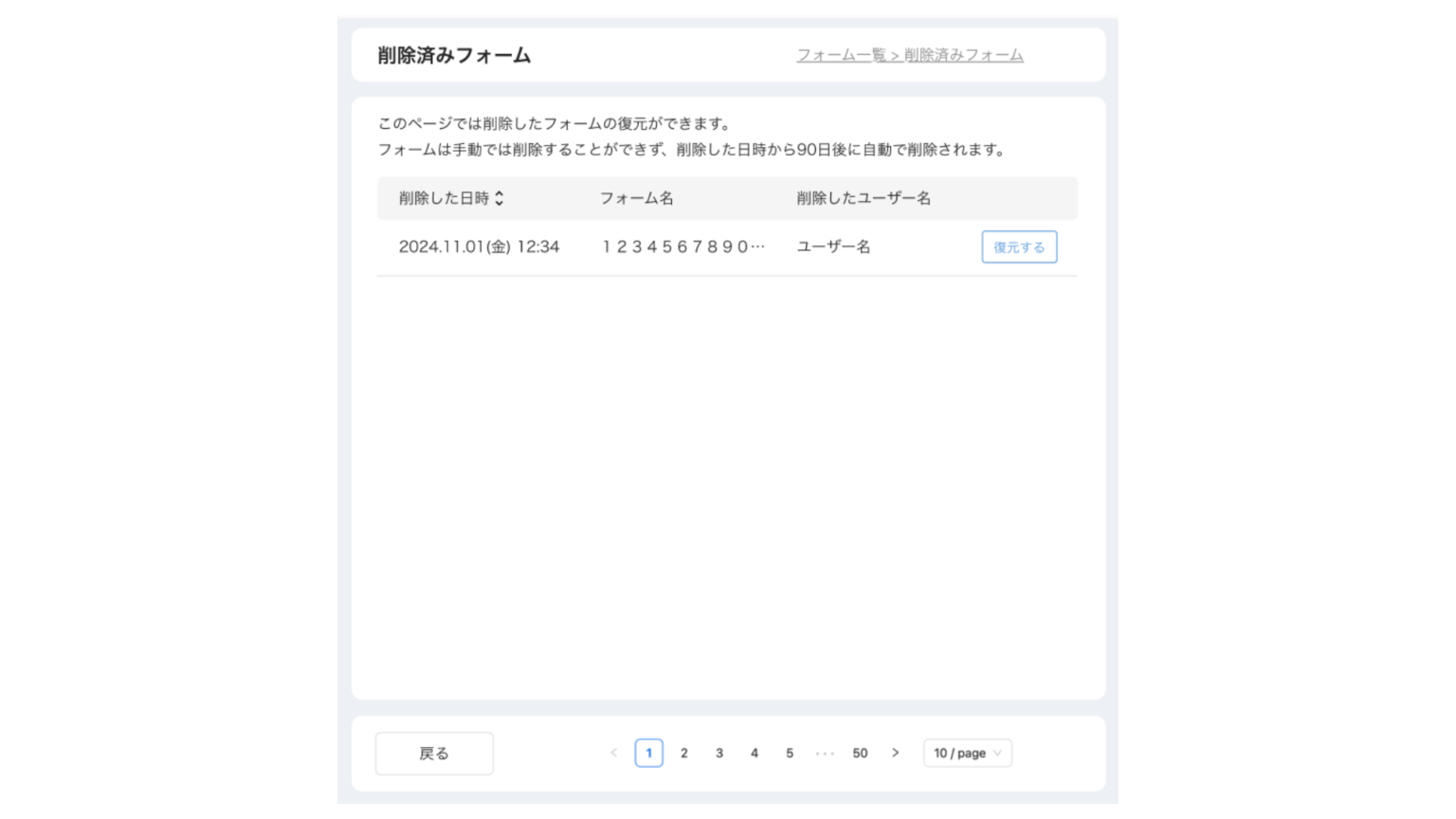 削除されたフォームは「削除済みフォーム一覧」に移動され、90日以内であれば簡単に復元可能です。