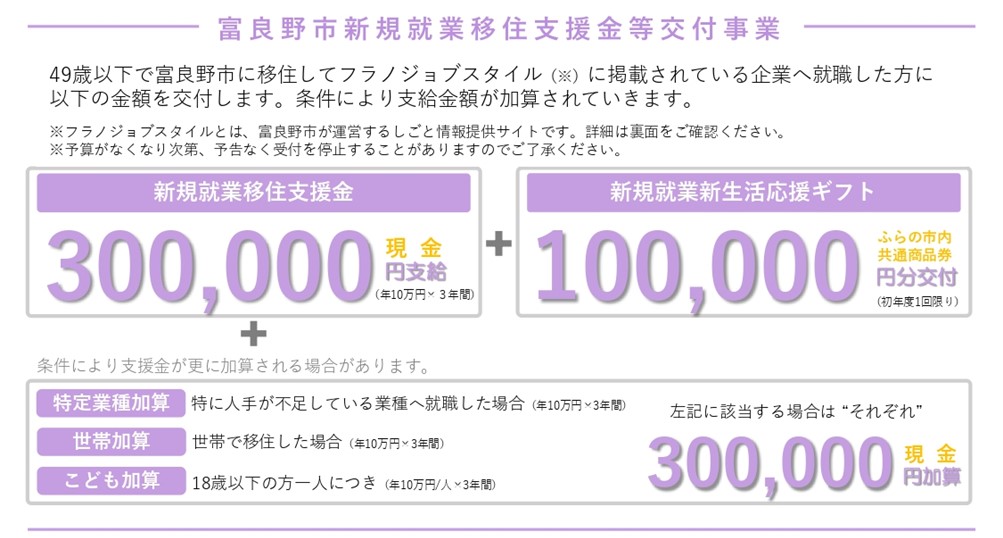 富良野市に移住して市内の事業所に就職した方に、支援金等を交付します。