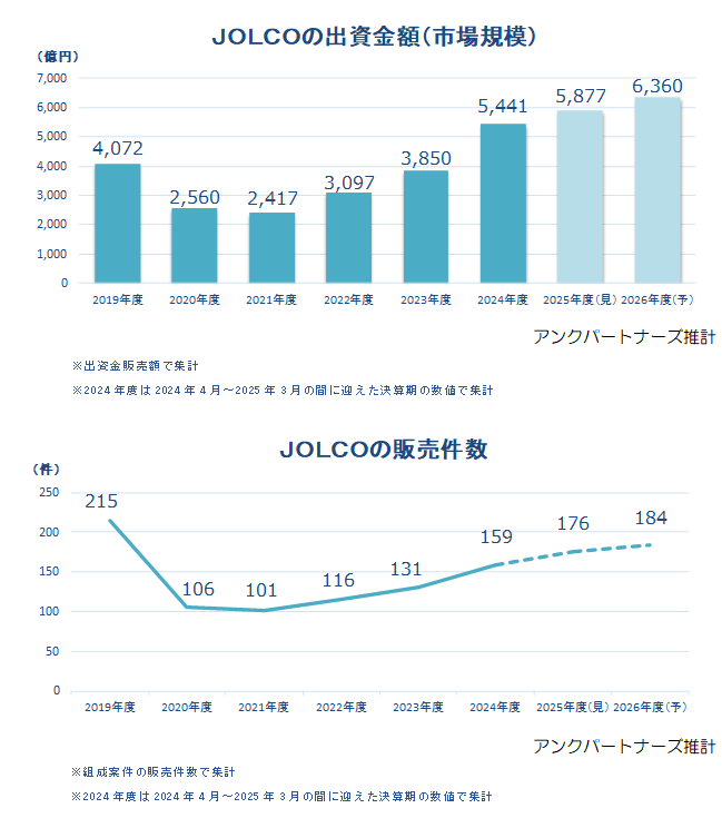 2024年度(2024年4月~2025年3月)のJOLCOマーケットの市場規模(出資金販売額ベース)を、前年度比で41.3%増の5,441億円、組成案件の販売件数を159件(同21.4%増)と推計した。