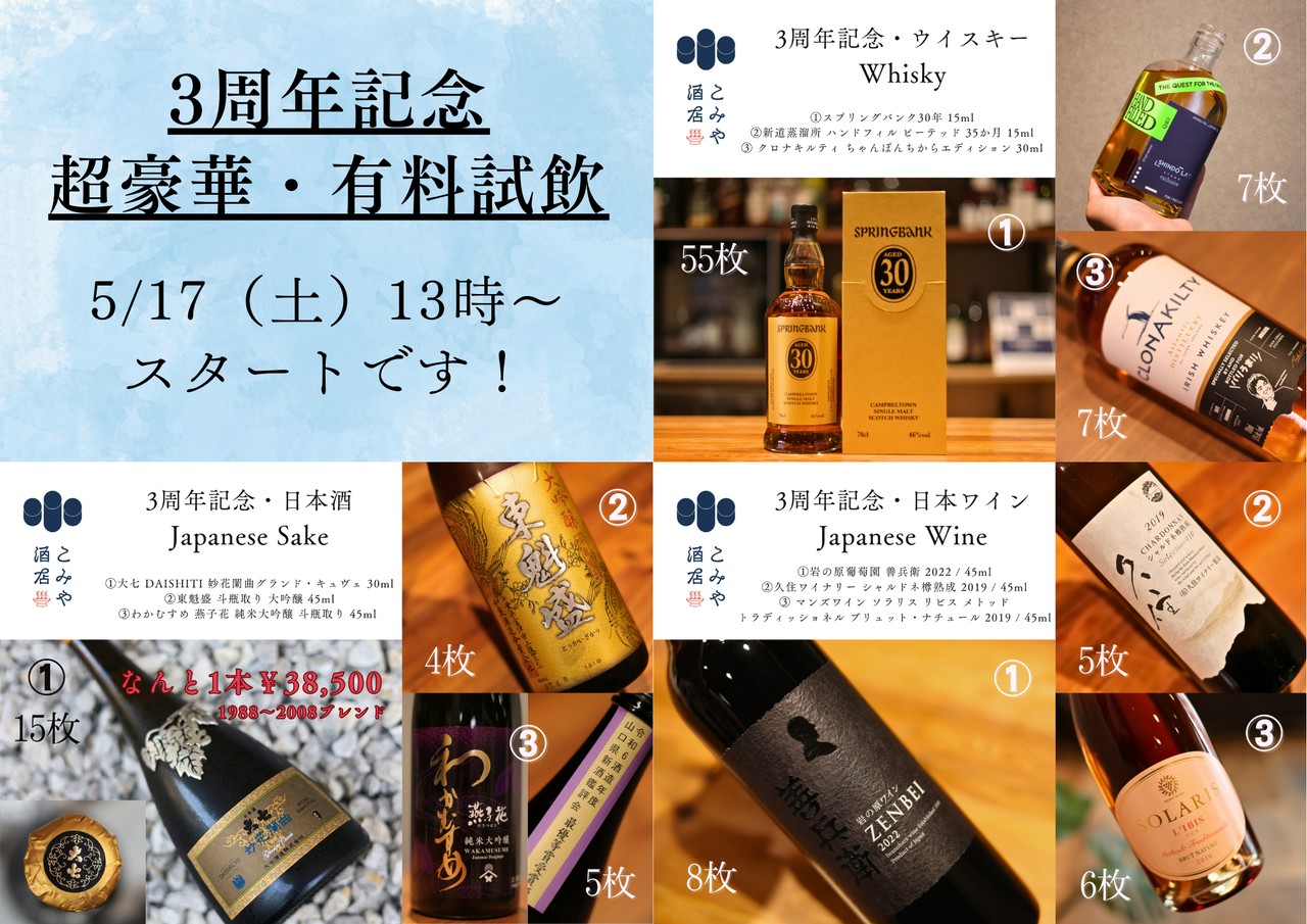 おかげさまでリニューアル3周年 こみや酒店オリジナル日本酒の限定販売や、特別なお酒の有料試飲提供。