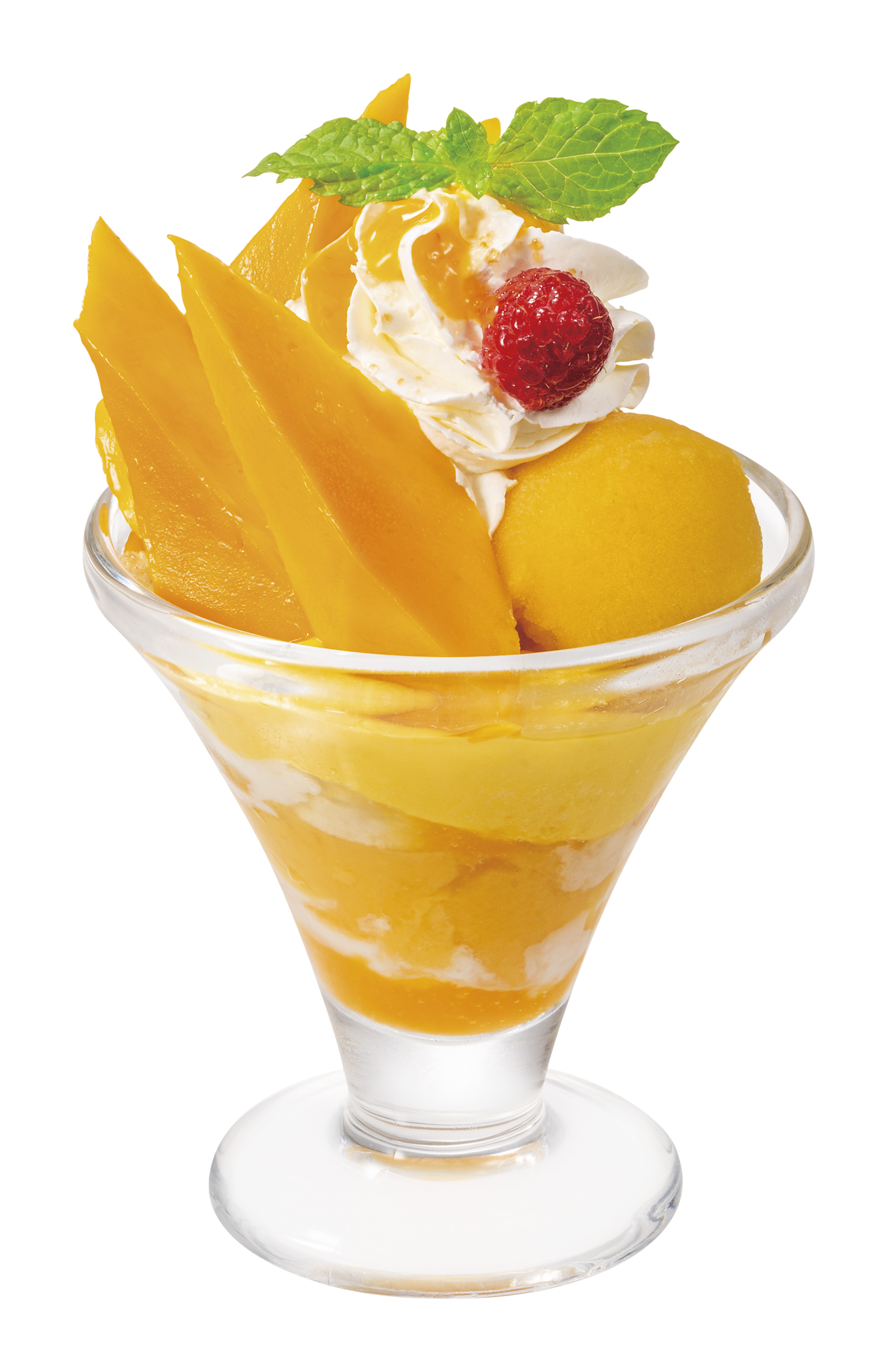 マンゴーがトップを彩る、トロピカルな雰囲気のパルフェ。太陽をたっぷり浴びたメキシコマンゴーは、とろけるようになめらかな果肉と、甘みと酸味の絶妙なバランスが魅力です。そのほかにも、濃厚なマンゴープリン、ひんやりとしたソルベ、まろやかなクリーム、フルーティーなソースと、マンゴーを使った素材をふんだんに。爽やかな風味が口いっぱいに広がる、初夏にぴったりなデザートです。