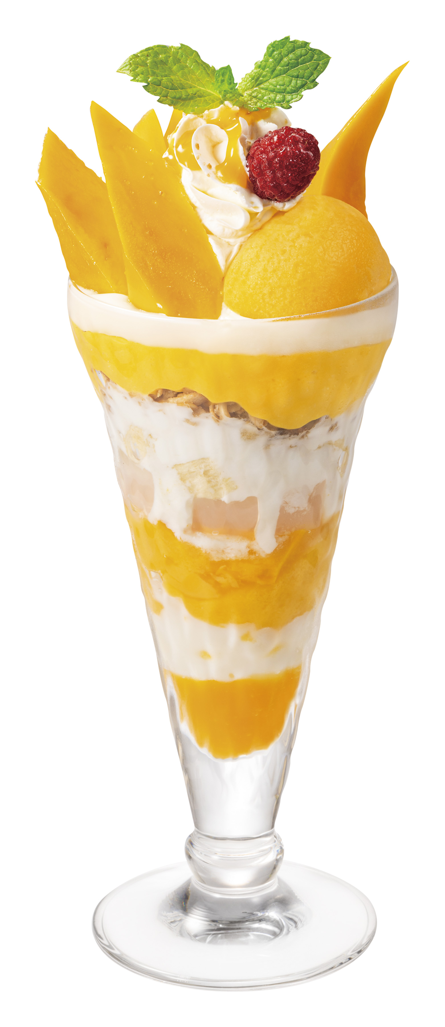 南国の太陽に育まれた、みずみずしいマンゴーのザ・サンデー。フレッシュなメキシコマンゴーをはじめ、濃厚なマンゴープリン、口どけのよいクリーム、爽やかなソルベなど、マンゴーづくしのデザートです。すっきりとした甘さのレモンチーズクリームが、トロピカルな風味にまろやかなコクをプラス。ナタデココやグラノーラの食感も軽やかなアクセントになっています。最後の一口までたっぷりとマンゴーを味わえる、贅沢なデザートをお楽しみください。