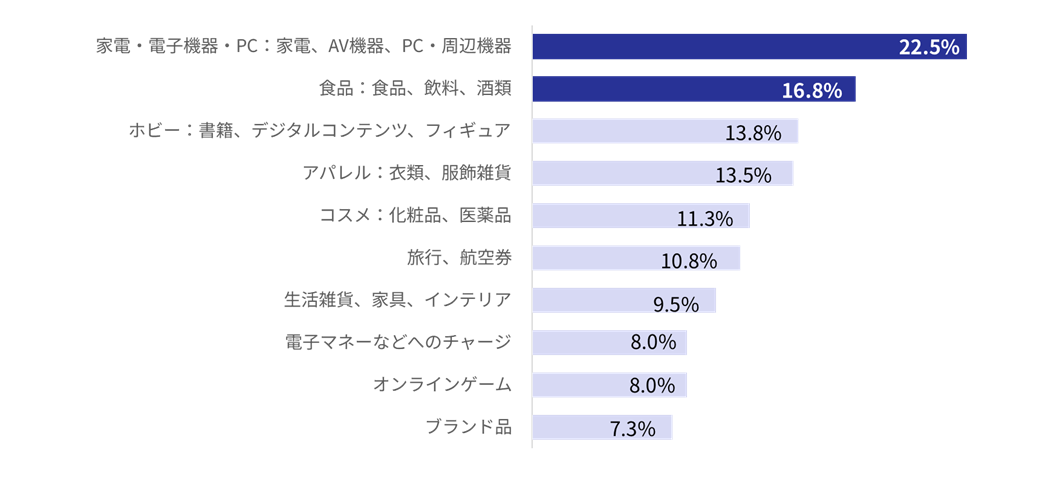 ①クレジットカード不正利用の対象商品は、「家電・電子機器・パソコン」が22.5%、次いで「食品・飲料・酒類」が16.8%と多かった。