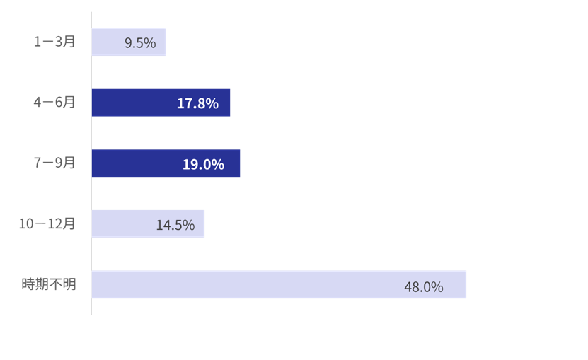 不正利用被害が発生した時期としては、7~9月が19.0%で最多、次いで4~6月が17.8%となり、春から夏にかけて被害が多い傾向が見られました。この傾向は、旅行や大型連休などの消費活動が活発化する時期に一致しており、不正者がこれらのタイミングを狙っている可能性が推測できます。ただし、不正利用は商品の需要によって突発的に発生することも多く、必ずしも特定の時期に限定されるものではありません。