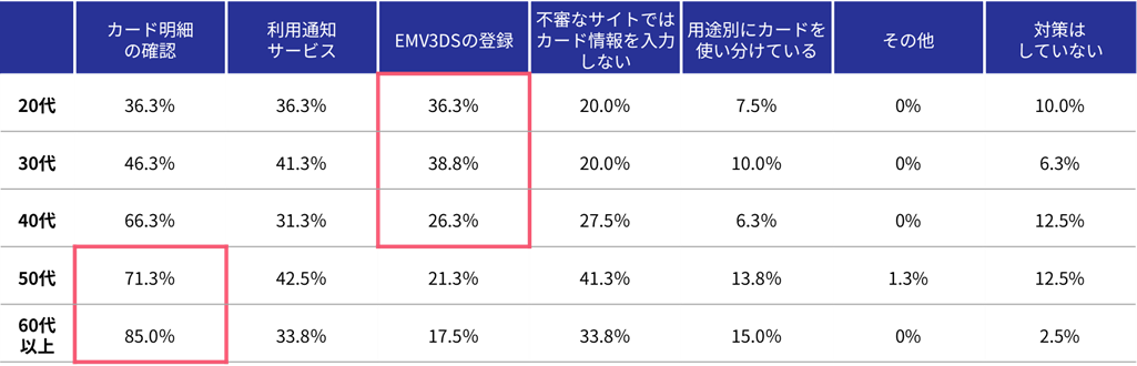 不正利用対策としては、「カード明細の確認」が61.0%で最多、次いで「利用通知サービスの登録」が37.0%、「EMV3-Dセキュアの登録」が28.5%となりました。EMV3-Dセキュア(本人認証サービス)は、2025年3月を目途に導入が推奨されていたこともあり、前回調査と比べて登録率は4ポイント増加しました。しかしながら、依然として3割未満にとどまっています。さらに、年代別の結果を見ると、40代以降の世代ではEMV3-Dセキュア登録率が年齢とともに低下する傾向が見られ、中高年層における認知度や登録の促進が今後の課題といえます。EC事業者側ではEMV3-Dセキュアの導入が着実に進んでいる一方で、消費者側での登録・活用については、なお一定の啓発や支援の余地があると考えられます。