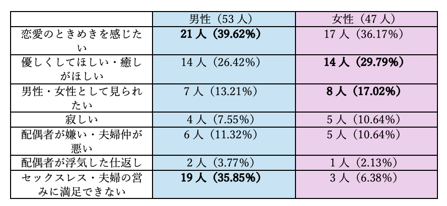 次いで「優しさや癒しがほしい」「セックスレスへの不満」「異性として見られたい」という回答が続きます。