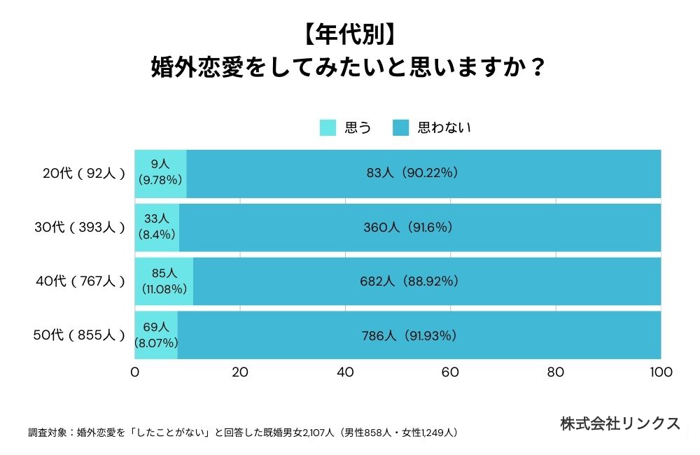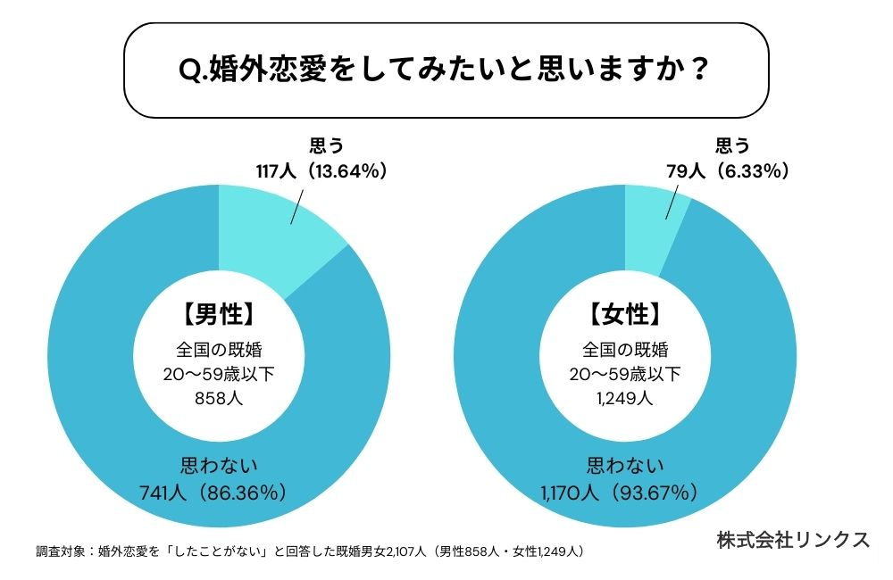 今回の調査では、婚外恋愛を未経験で「してみたい」と感じる既婚者が約1割いることが明らかになりました。