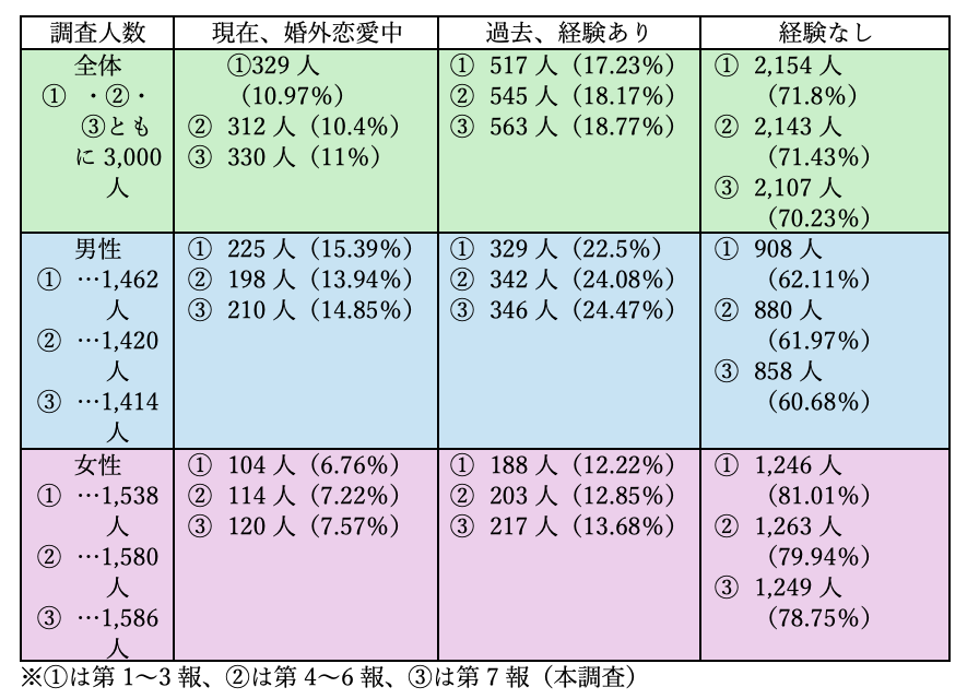 3,000人中、「現在婚外恋愛中」は11%、「過去に経験あり」は18.77%。