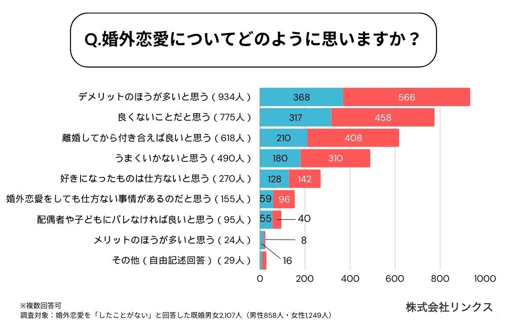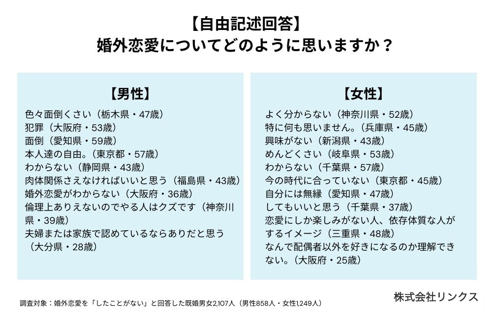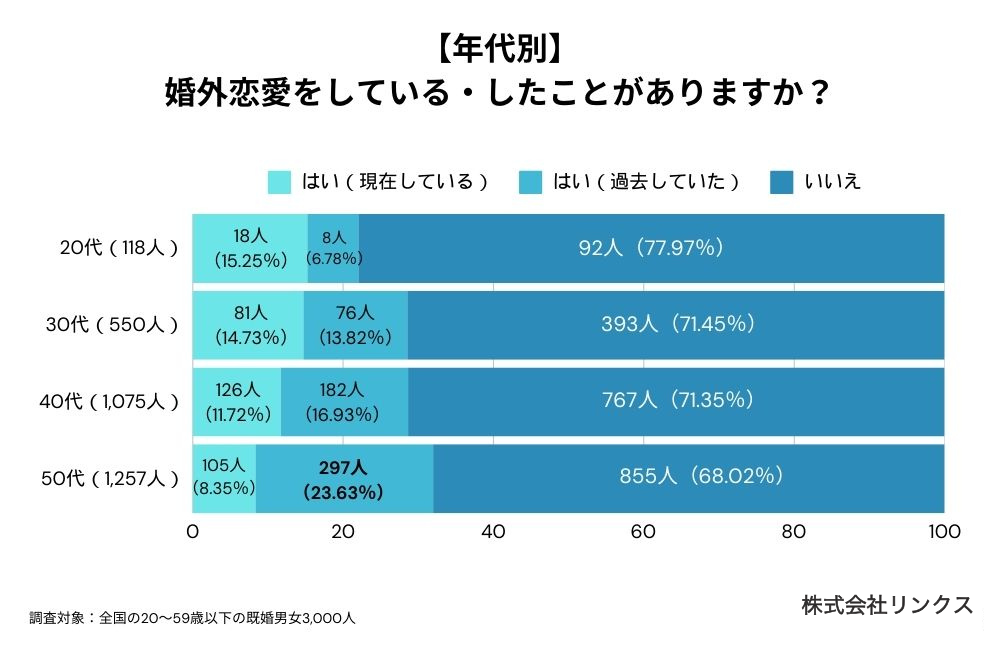 既婚者向けマッチングアプリ「既婚者クラブ」のユーザーを対象に、株式会社リンクス(東京都港区)が全国の20歳~59歳までの既婚男女3,000人を中心に、「婚外恋愛の実態調査」を実施しました。