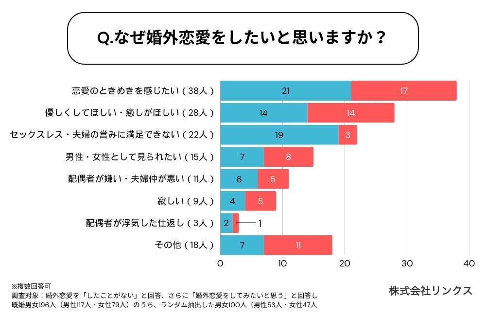 婚外恋愛願望者196人に、その理由を尋ねた結果、最も多かったのは「恋愛のときめきを感じたい」。