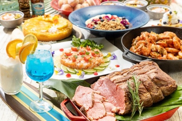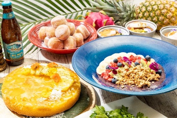 デザートは豊富なトッピングが楽しめるパンケーキやアサイーボウルなど、定番のハワイアンスイーツに加え、シェイブアイスやポイドーナツなどハワイのご当地スイーツもご用意。また、期間中は米・ハワイ州の「プリンスリゾーツハワイ」からシェフがやってきてゲストの目の前で調理を行うライブキッチンを担当。南国の非日常を感じながらハワイアングルメをお楽しみください。