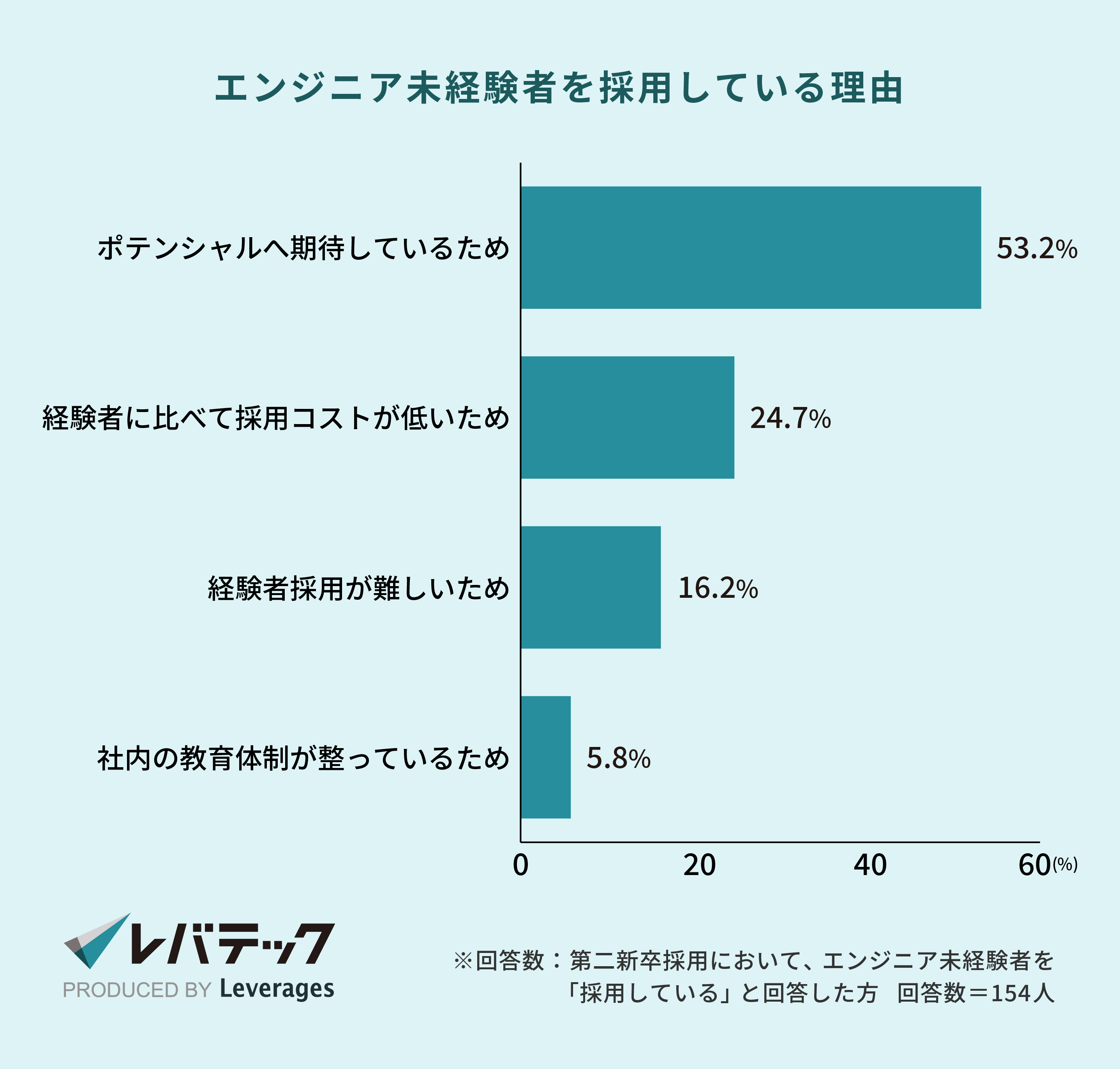 採用している理由は「ポテンシャルへ期待しているため(53.2%)」が最多となり、将来的な成長を見込んで積極的に未経験者も採用している様子がうかがえます。