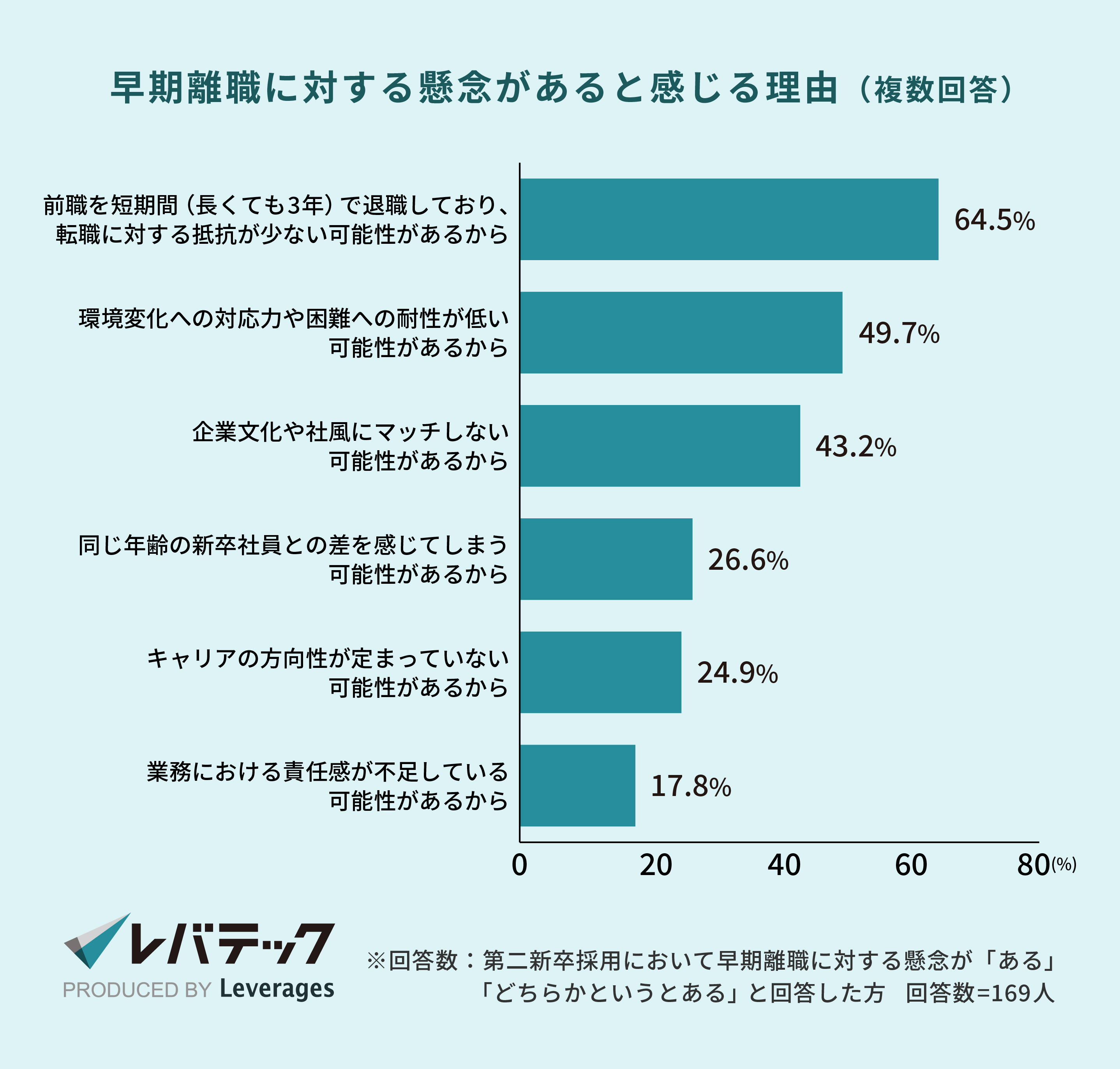 第二新卒の採用において、早期離職に対する懸念があると回答した採用担当者は約8割でした。理由としては「前職を短期間(最長3年)で退職しており、転職に対する抵抗が少ない可能性があるから(64.5%)」「環境変化への対応力や困難への耐性が低い可能性があるから(49.7%)」が挙げられます。