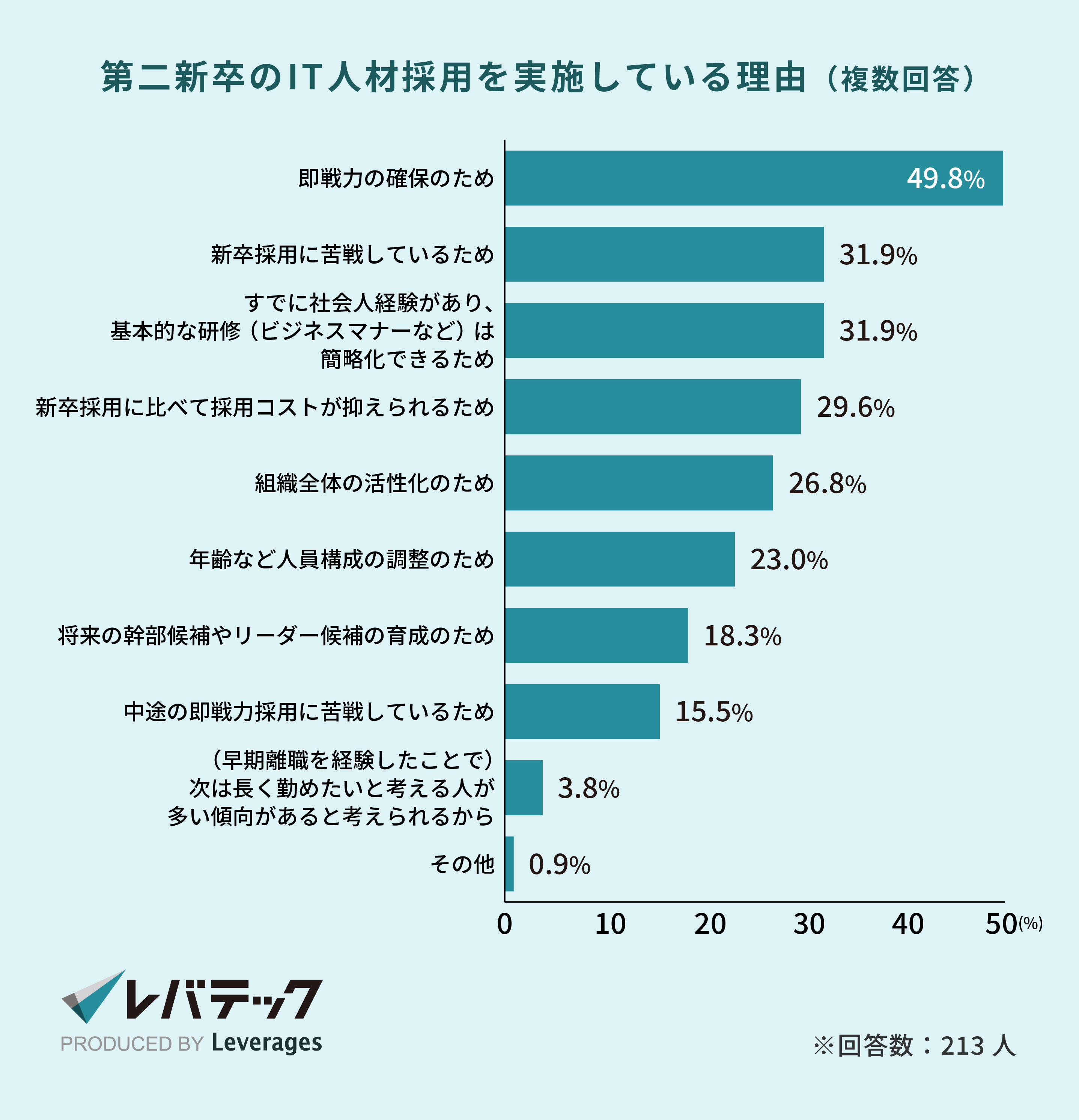 第二新卒*1のIT人材を採用している企業に対して、採用を実施する理由を尋ねると「即戦力の確保のため(49.8%)」が最も多く、「新卒採用に苦戦しているため(31.9%)」「すでに社会人経験があり、基本的な研修(ビジネスマナーなど)は簡略化できるため(31.9%)」が同率2位という結果になりました。