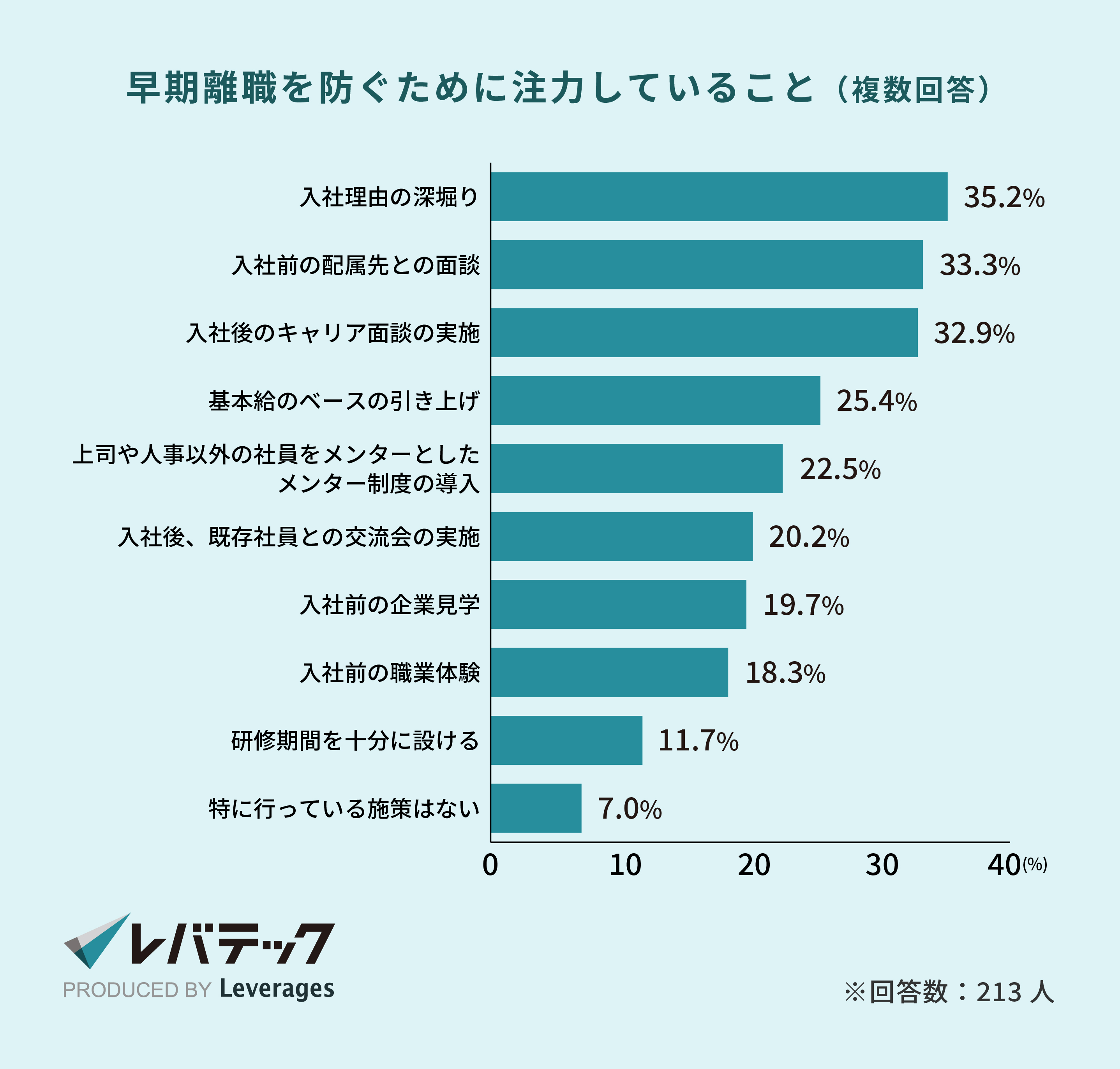早期離職を防ぐための取り組みとして最も多かったのは「入社理由の深堀り(35.2%)」でした。採用段階で候補者の志向や価値観を丁寧に確認し、ミスマッチを防ぐことが重要視されています。さらに、4社に1社は「基本給のベースの引き上げ(25.4%)」と回答し、採用活動時点でのコミュニケーション強化だけなく、待遇改善による人材確保や定着支援の動きも見られました。