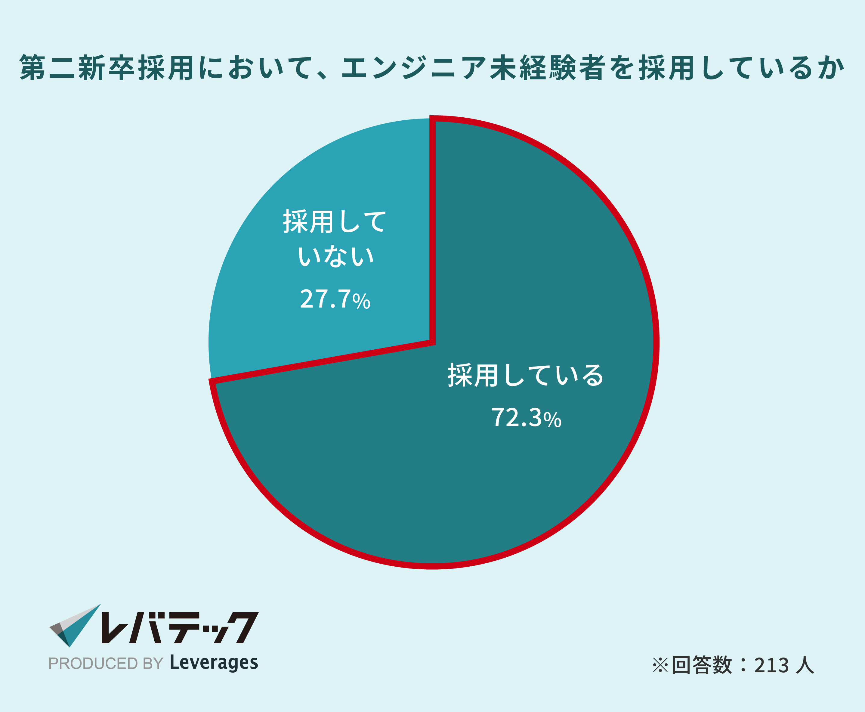 第二新卒の採用において、エンジニア未経験(以前エンジニア職でなかった)の人材を採用していると回答した採用担当者は7割を超えました。
