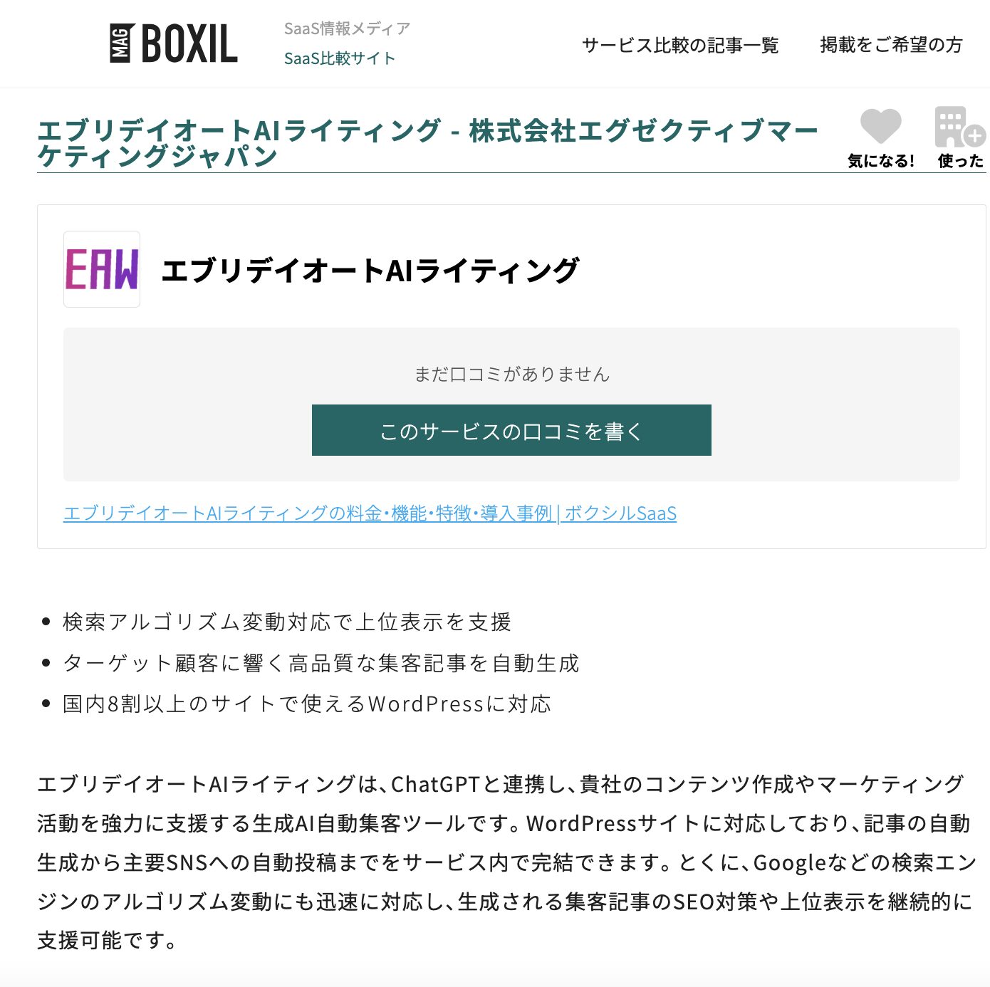 株式会社エグゼクティブマーケティングジャパン(本社:北海道札幌市中央区、代表取締役:深作浩一郎)は、当社が開発・提供する無料WEB集客完全自動化AIツールエブリデイ・オート・AI・ライティング(以下、EAW)が、国内最大級のSaaS比較サイトBOXIL(ボクシル)にて紹介されたことをお知らせいたします。