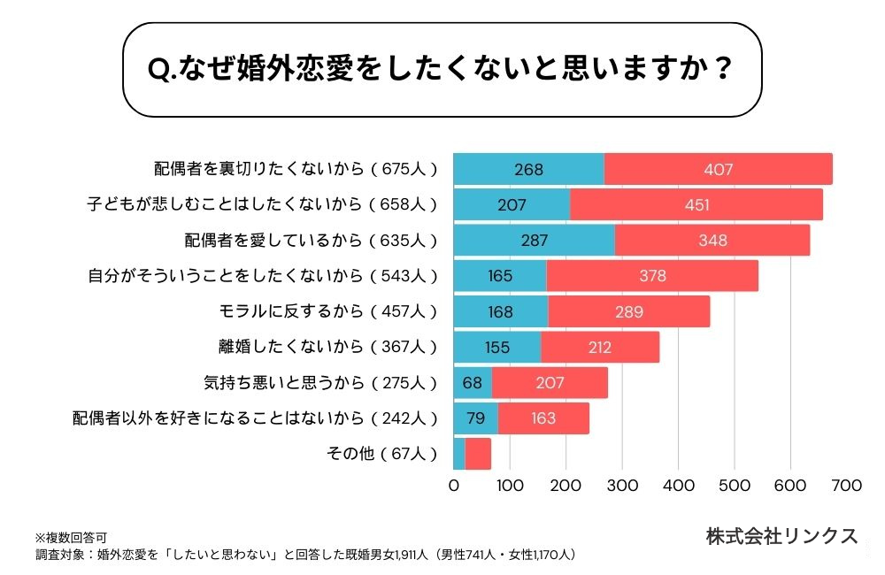 婚外恋愛未経験かつ「したくない」と回答した1,911人の理由トップは「配偶者を裏切りたくないから」(35.32%)、次いで「子どもが悲しむから」(34.43%)、「配偶者を愛しているから」(33.23%)。